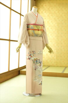 ■0532-39-7660 標準サイズ 身長・・・151cm〜161cm位 洋服サイズ・・・7号〜11号位まで 商品説明 ベージュを帯びたピンク地に雅な王朝絵巻を扇面に 描いた礼装の場にふさわしい訪問着です。